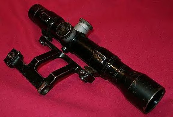Sold on Ebay auctions was a RPG scope that had been modified by the Bosnians for sniper usage on an AK rifle. It was removed from a Yugo AK rifle in Bosnia and brought back to the United States by an SFOR soldier. It is feasible this scope could have been used mounted to an SKS also. Mounted on an SKS the scope is offset to left and prevents the spent casings from damaging the optics. Unfortunately an SKS with this mount would be awkward to shoot placing the scope very high, but it would still be a plausible configuration as the Bosniacs were very resourceful. Another possibility is a commercial scope. Phillip Bryant spent two years in Bosnia. One contact of his in the Bihac region informed him that they used 4X commercial optics on their SKS rifles. Several other contacts indicated they used anything they could get their hands on. Though none have been found in the recent import of SKS rifles from Bosnia or Croatia, commercial ChiCom 4x scopes were reportedly obtained and used in Bosnia. Perhaps even supplied by sympathetic IFOR Soldiers. Bosnians were quite resourceful, so again, anything is possible.